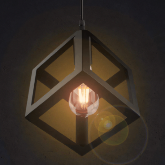 • Striking metal square cube-shaped hanging light with a warm, inviting glow